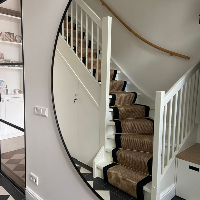 Deze vrijwel smalle hal is heel klassiek gehouden met een vloer gelegd in het dambordpatroon in zwart-wit en gecombineerd met industriële elementen. Door de grote ronde spiegel van staal oogt de ruimte gelijk groter en de maat zorgt voor een WOW-effect. Het staal komt terug in de twee industriële hanglampen en de deur die naar de woonkamer leidt. Naast de kleuren zwart en wit is hout als "kleur" gebruikt. Ze komt terug in de inbouwgarderobe en in de traploper. De traploper zorgt voor elegantie en een luxe uitstraling.